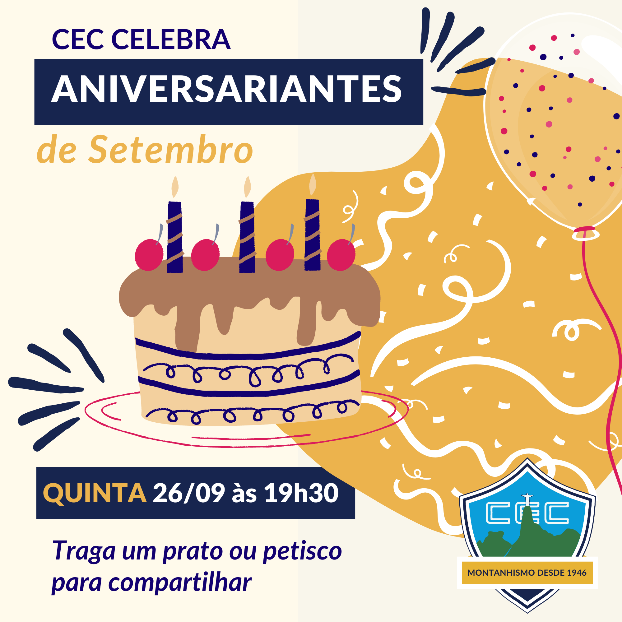 Nós garantimos o bolo e convidamos você a cantar parabéns para nossos amigos montanhistas. Fiquem a vontade para trazer e compartilhar outros pratos & guloseimas!