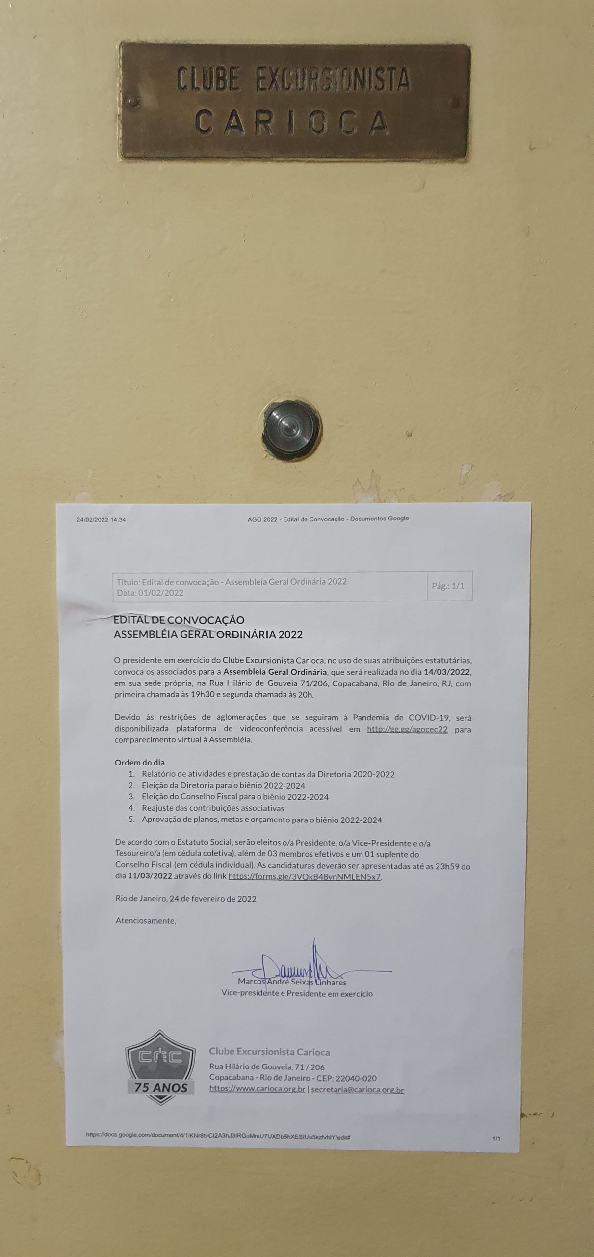 EDITAL DE CONVOCAÇÃO ASSEMBLÉIA GERAL ORDINÁRIA 2022 O presidente em exercício do Clube Excursionista Carioca, no uso de suas [...]