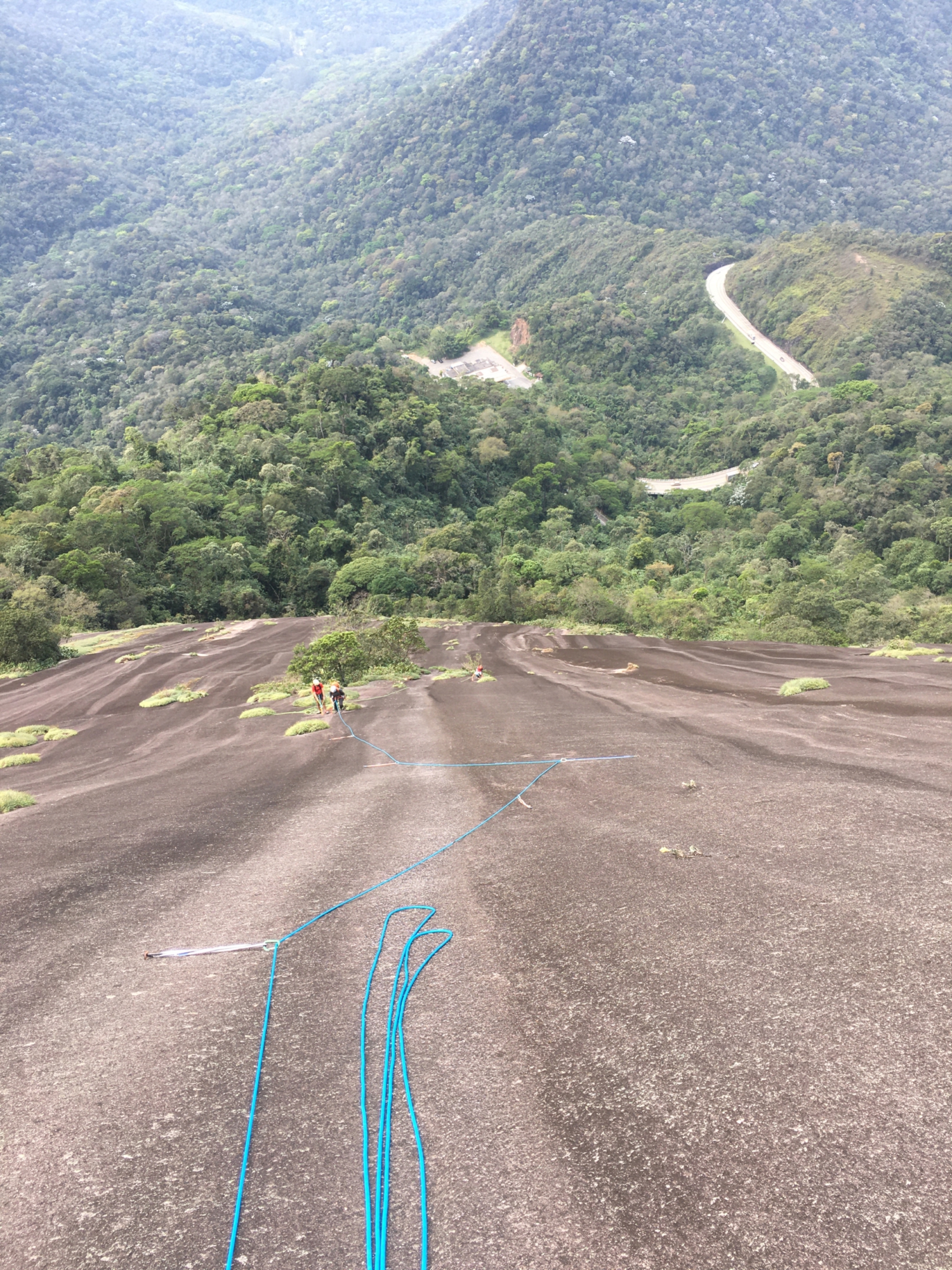 Estávamos cansados, e por isso não fizemos a trilha final até o cume. De onde termina a via decidimos descer pela trilha, que foi tranquila, mas com certo congestionamento de pessoas, vários grupos descendo ao mesmo tempo. No final da descida, onde se pode fazer dois rapeis, havia uma fila de pessoas para descer, dentre elas um grupo da Unicerj. Quando chegou a nossa vez de rapelar, nos sugeriram emendar uma das nossas cordas com a deles para acelerar o rapel – não pensamos duas vezes e assim, por fim, conseguimos acelerar a descida. No fim deu tudo certo e chegamos cansados no carro, porém muito felizes, já planejando a empreitada da próxima temporada “Infinita Highway”.