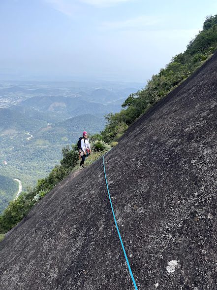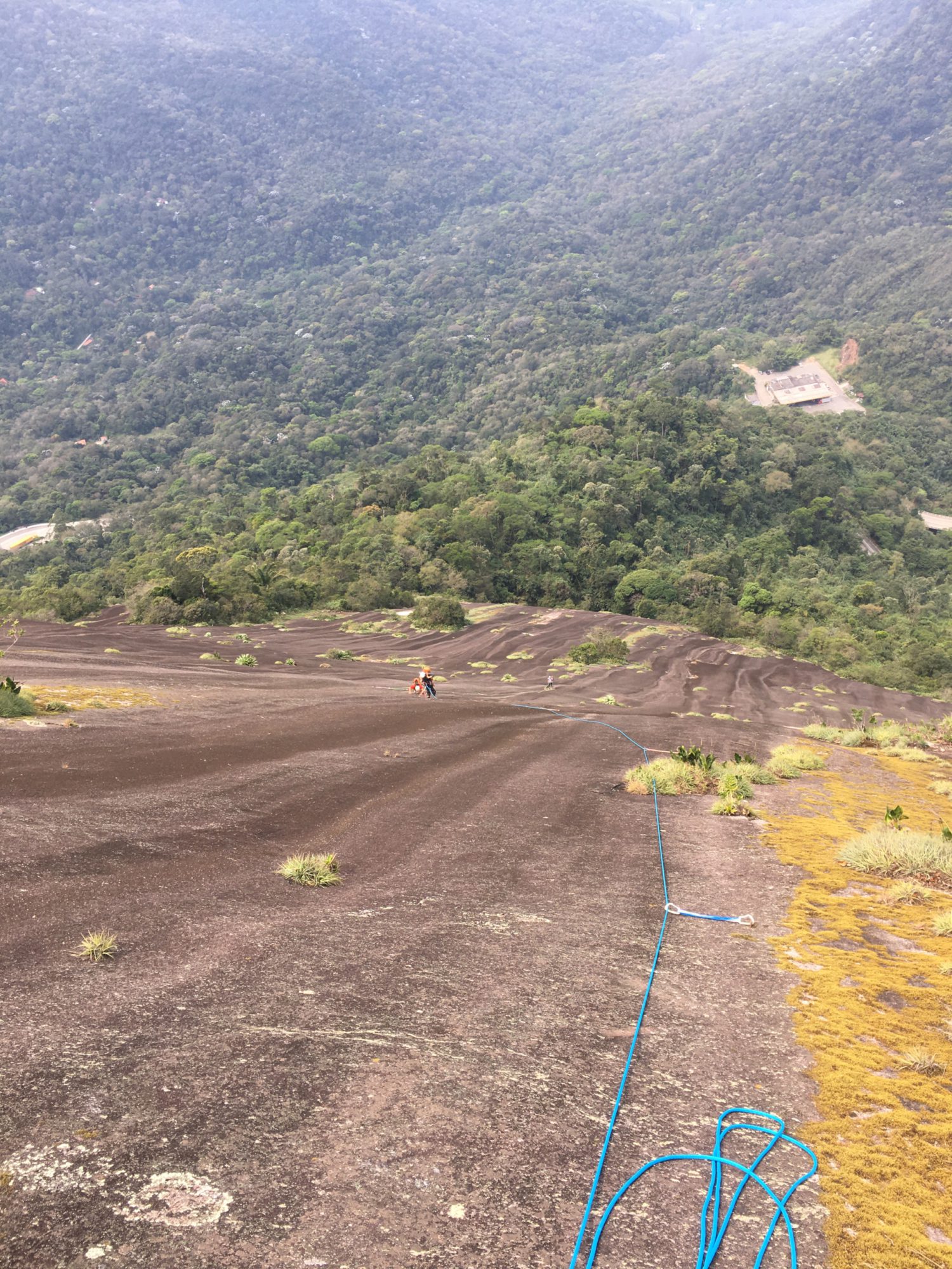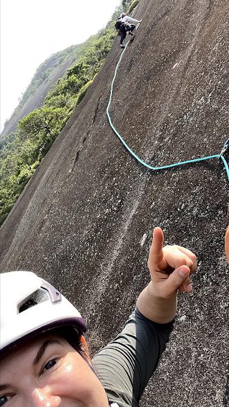A partir da da P4 é quando a brincadeira começa de verdade, a sujeira da via atrapalha, saída em fator com grampo longe (chuto uns 15/20m) e já dois “mini-crux” de 5° nesse esticão. Esticão esse que eu não queria guiar, mas era minha vez e nosso plano era cada uma “segurar o seu b.o.”, assim ninguém ficava sobrecarregada. Foi melhor do que eu esperava (acho que estava empolgada), a via estava suja, usei uma escova para limpar alguns lances e pouco tempo depois estava na P5, e chamei a Kyra. Agora o próximo esticão era dela – esticão do crux – um VI protegido, e talvez pior para o participante. Kyra saiu guiando bem, mas um pouco antes do crux escorregou e parou no grampo, foi só um pequeno susto, ela parou e leu como deveria fazer o lance e seguiu sem titubear, depois passou pelo crux de VI sem ao menos descobrir o local exato, passou fácil! Eu vim atrás sem muitos problemas, pois esse lance o Leandro (quando foi comigo em 2018) tinha me dado todas as dicas e eu lembrava bem.